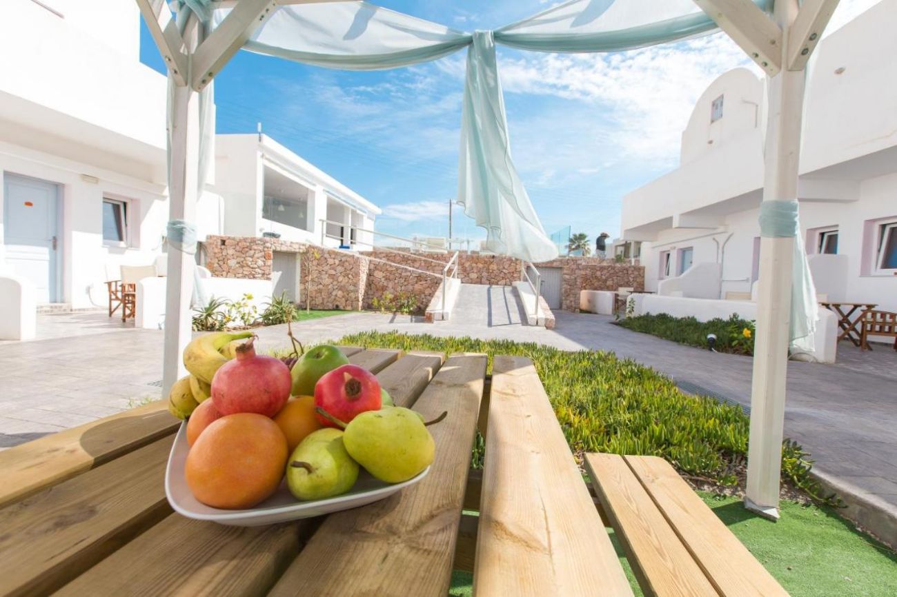 Черният пясъчен плаж на Периволос се намира на минута от хотела. Има зони с доплащане за чадъри шезлонги, и такива само с консумация в съответния ресторант или бар.