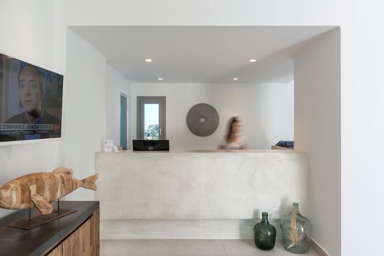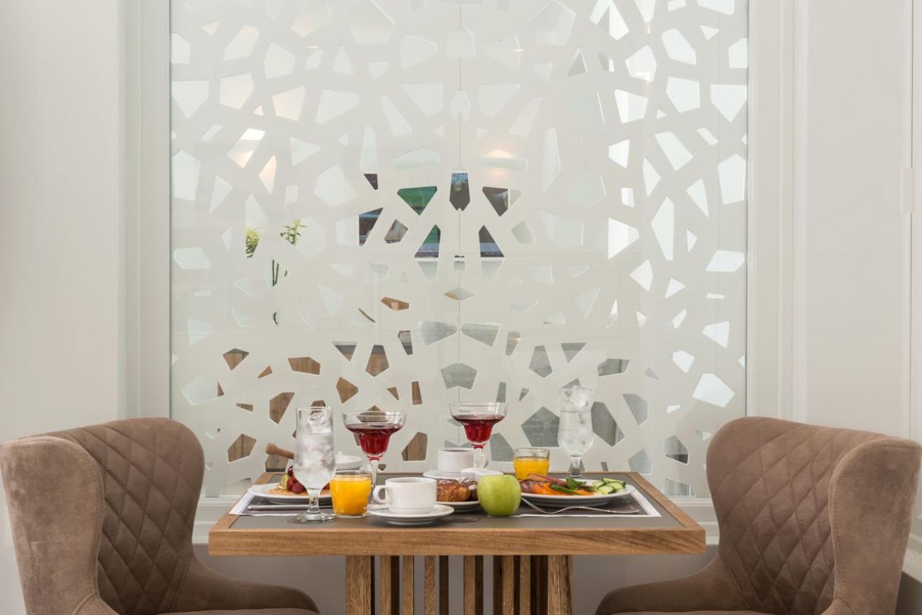 На терасата за закуска се сервира закуска с гръцко кисело мляко, традиционни специалитети и домашни сладкиши. В бара край басейна, заобиколен от палми, се сервират коктейли, кафе и леки закуски.