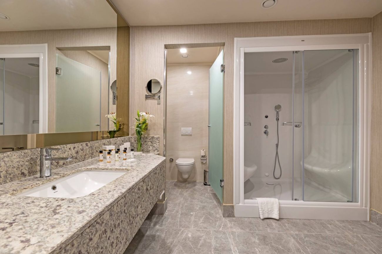 Стаите разполагат с централна климатизация (отворена в определени часове, в зависимост от метеорологичните условия), сателитна телевизия, мини бар (вода, безалкохолни напитки и бира - пълнене 1 път на ден, дневна), телефон с директно избиране, баня с душ с функция за парна кабина, сешоар, халати (срещу допълнително заплащане), чехли (безплатно), кана, комплект за чай и кафе, меню за възглавници (срещу допълнително заплащане), дрешник, работно бюро, сейф, балкон, WI-FI, под - дървен паркет и малък килим.