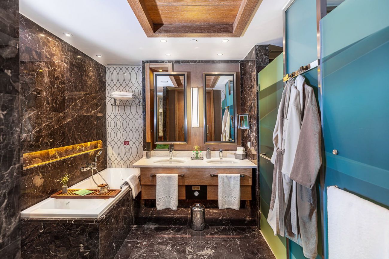 2 тристайни Presidential Suitе room sea view (хол с мека мебел, 2 спални с врата, 2 бани: 1 с джакузи и душ, 1 само с душ, голям балкон, макс. 4+1 чов., 150 м2, VIP-обслужване)