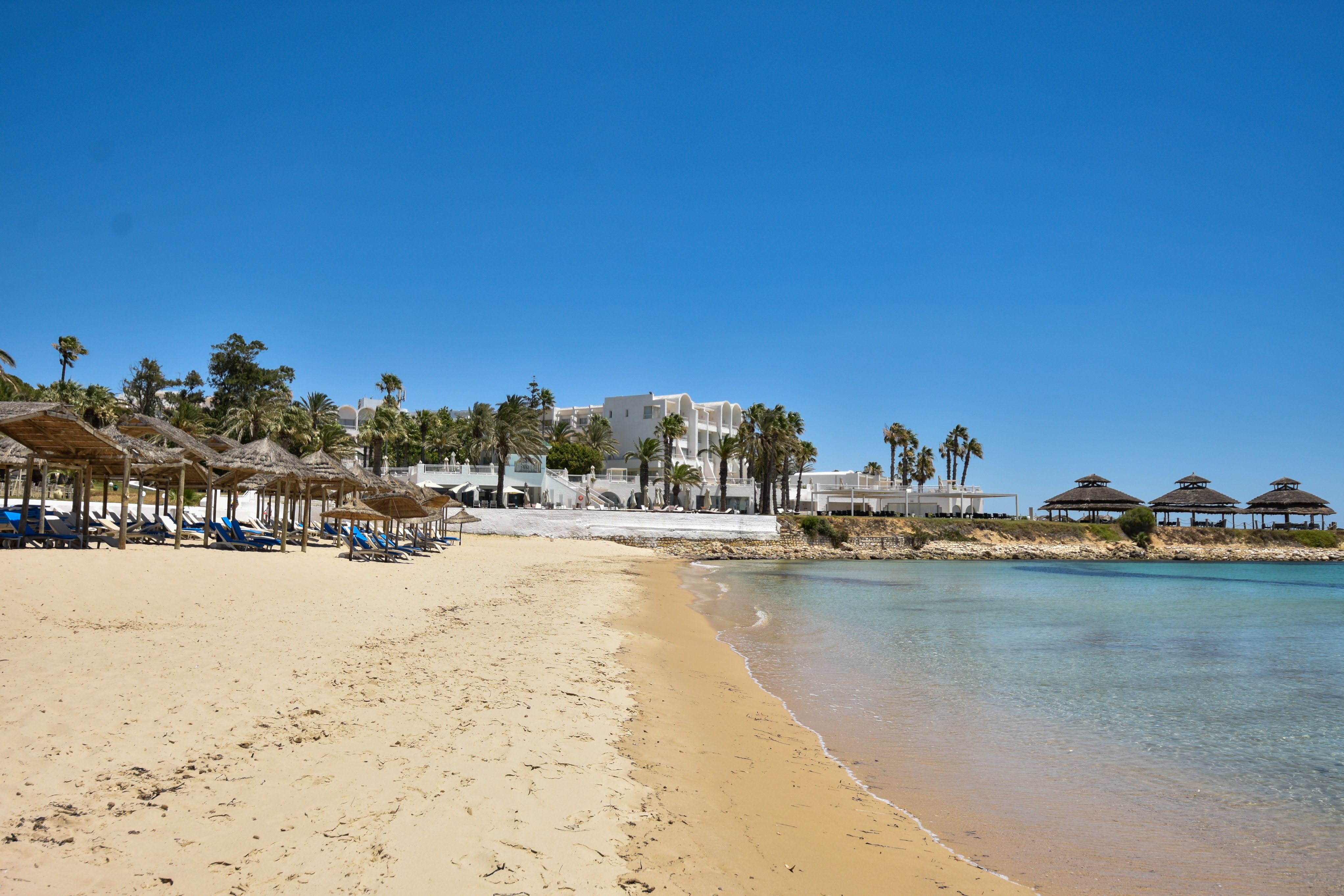Собствен, пясъчен. Чадъри, шезлонги, матраци - безплатно. Плажна фута (специално проектирана тунизийска кърпа) - безплатно, с депозит.