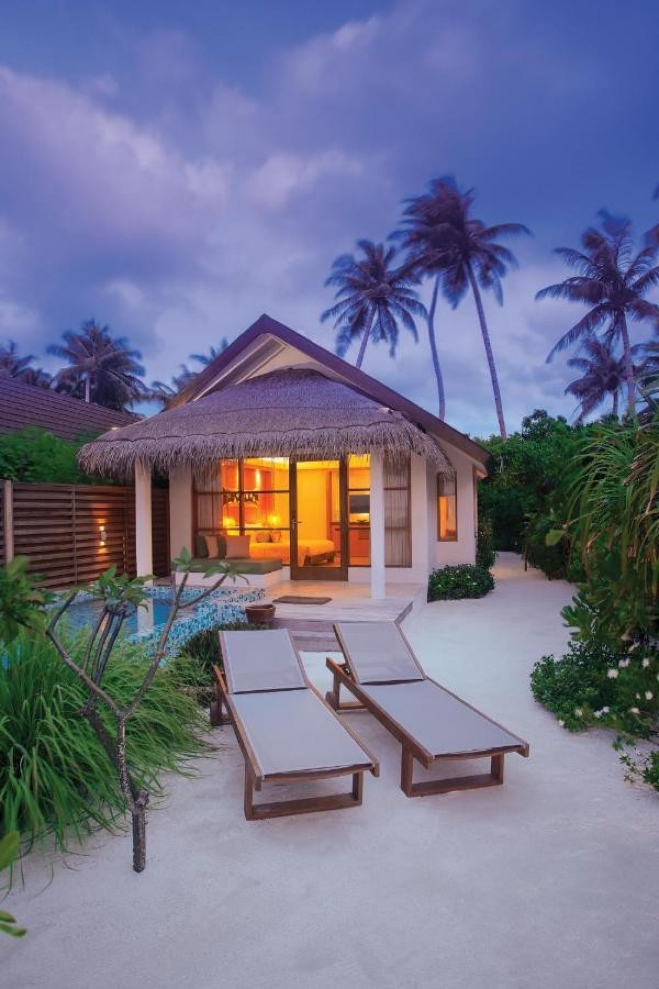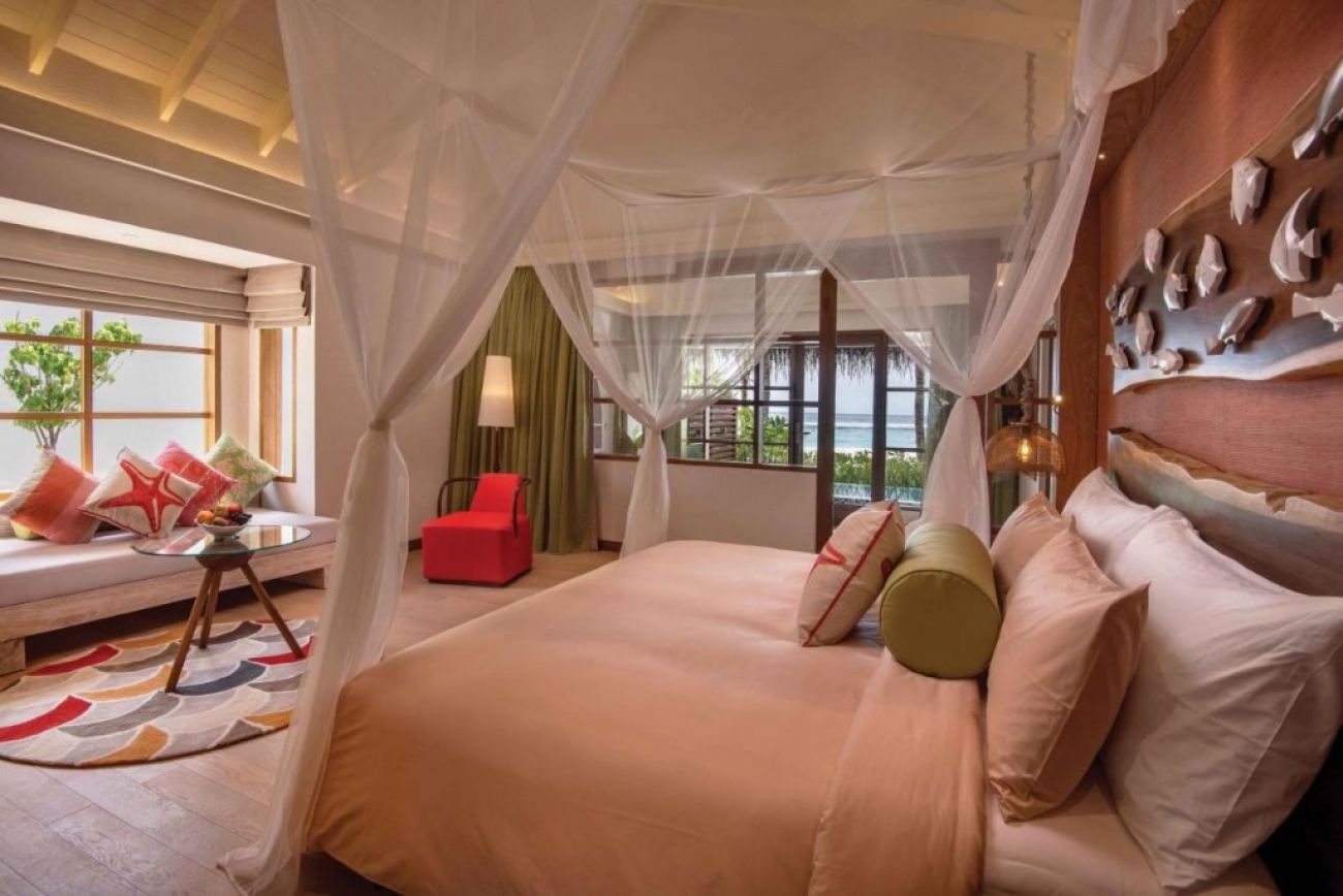В стаите: Гостите се настаняват в просторни, светли и красиво обзаведени самостоятелни вили, които осигуряват пълно уединение и идеални условия за почивка. Има 6 категории помещения, разположени на брега и над водата. Плажните вили са с голяма площ от 81 кв. м, оборудвани с всички необходими удобства. Имат отворена баня, веранда и директен достъп до плажа. Всяка стая разполага с вана и душ, удобства за приготвяне на чай и кафе, тоалетни принадлежности и сейф. Басейнът е на разположение на всички стаи с изключение на плажната вила и водната вила. Стаята се почиства ежедневно. Ще имате на разположение също тераса, съблекалня, климатик, минибар с безплатна бира, вино, безалкохолни напитки и закуски. В стаята са включени безплатен Wi-Fi и телевизор.