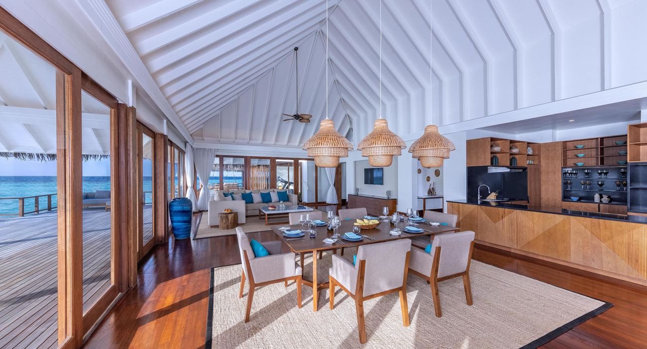 - 2 Two Bedroom Sunset Over Water Pool Residence (~1861 кв.м) - водни вили с басейн и изглед към залеза. Състои се от просторна дневна с трапезария, двойно легло с кралски размери и две съблекални, спални с отделни легла и две съблекални, две бани с хидромасажна вана и душ, тераса с басейн, шезлонги, люлка, кът за хранене и спускане във водата. Максимално настаняване - 6 възрастни и 2 деца или 4 възрастни и 4 деца.