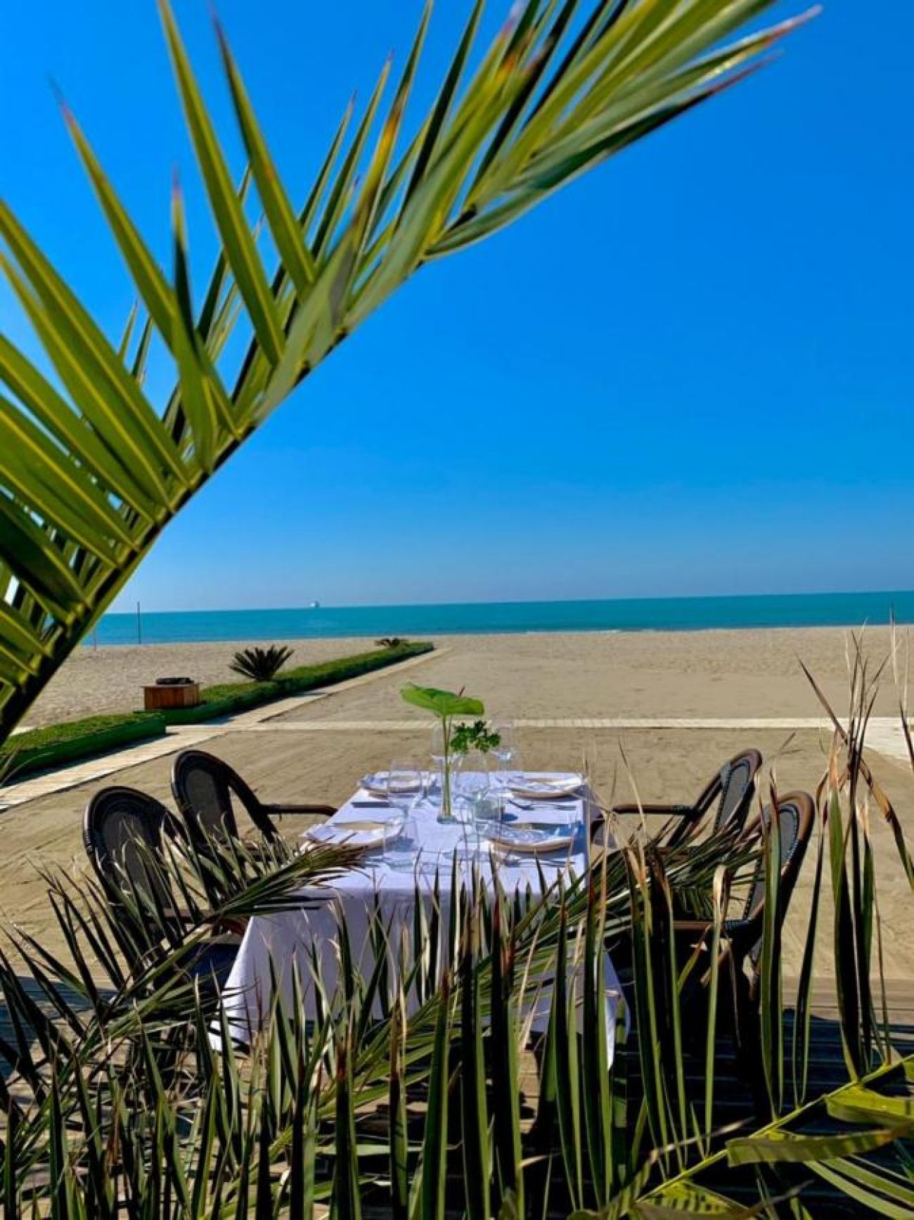 Собствен, пясъчен, на 100 м от сградата на хотела. Чадъри и шезлонги на плажа и при басейна – безплатно, плажни кърпи - срещу заплащане.
