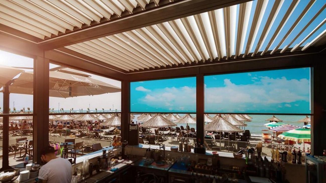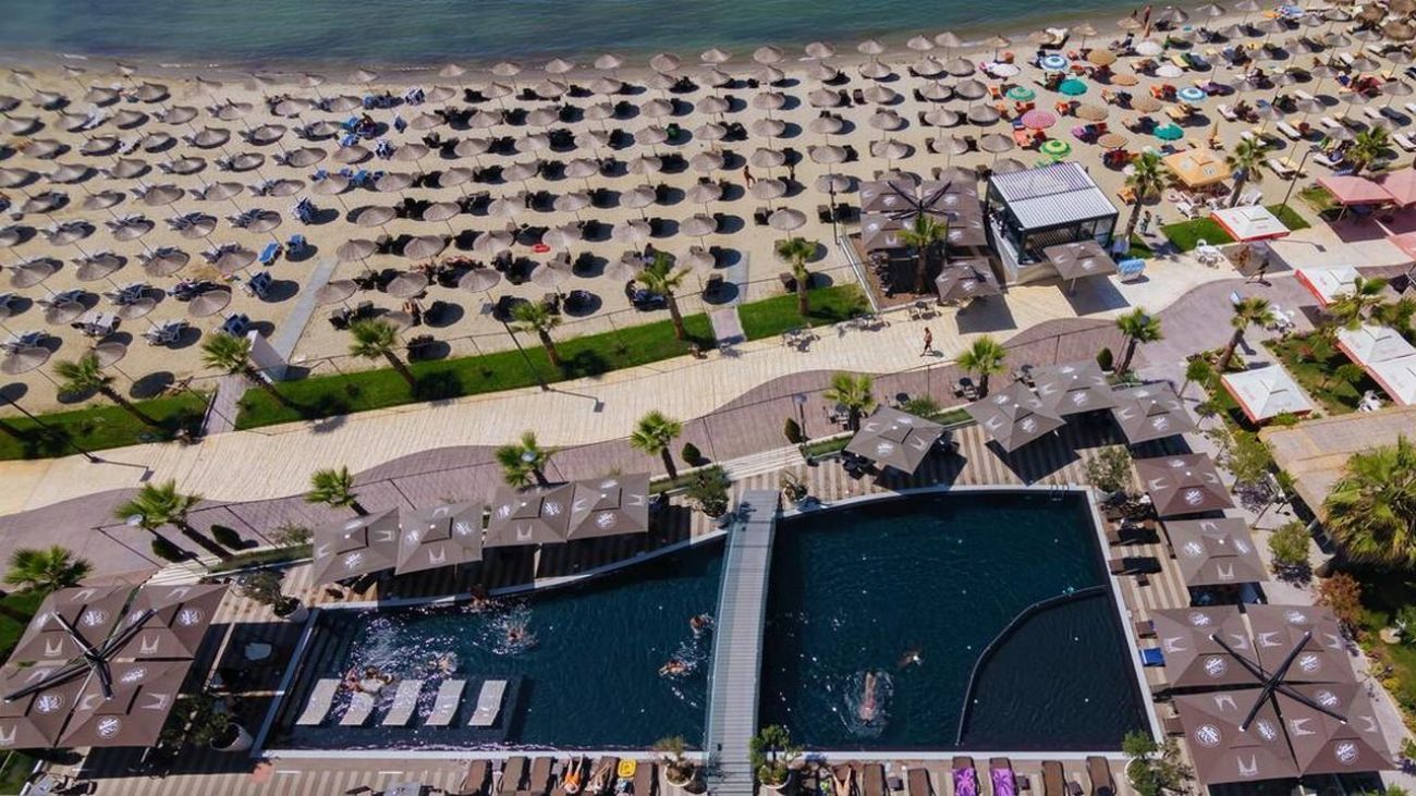 - Частен пясъчен плаж с шезлонги и чадъри