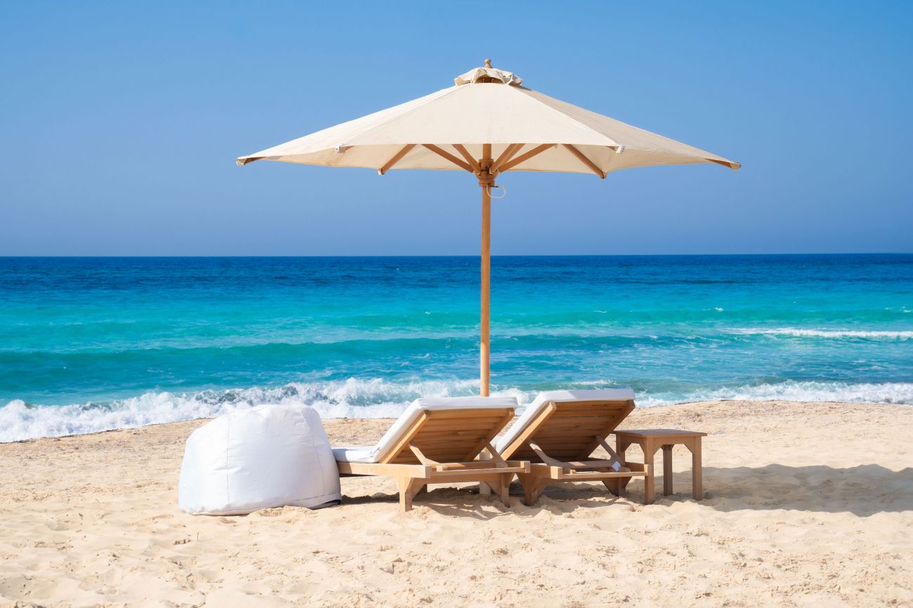 Собствен, пясъчен. Чадъри, шезлонги, матраци и плажни кърпи на плажа и при басейна - безплатно.
