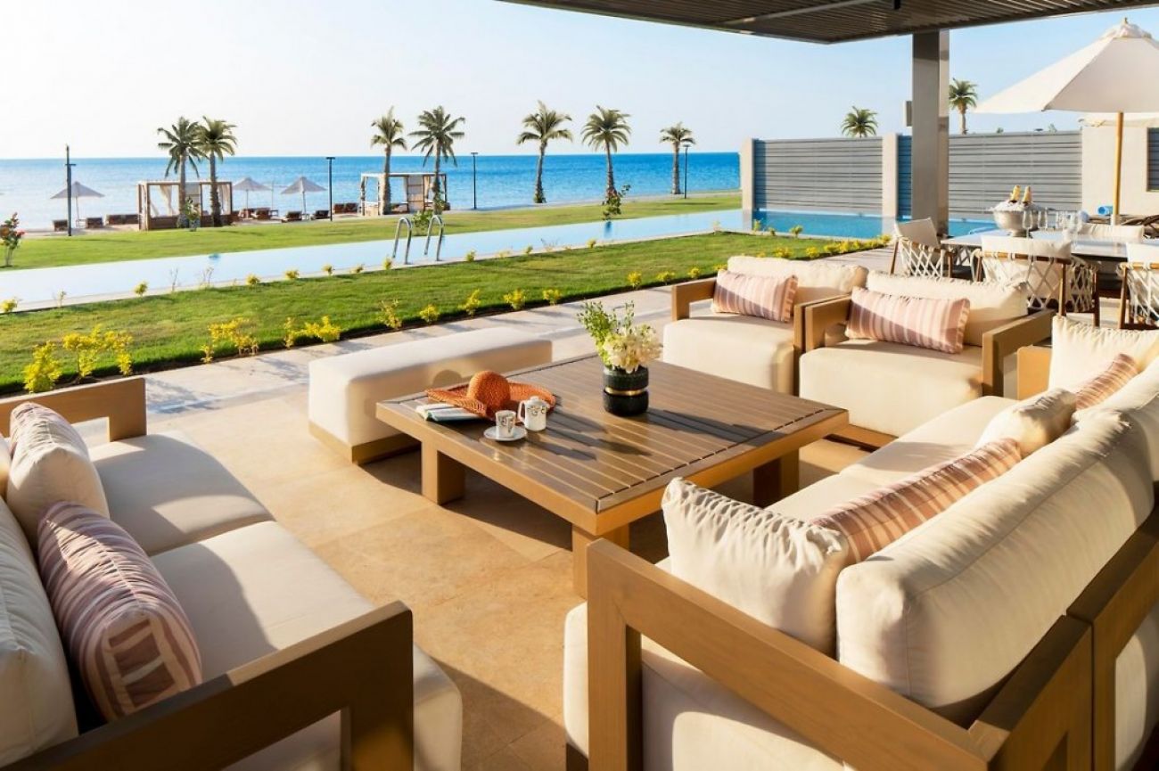 Royal Villa (Sea & Pool View, 944 м2, луксозна и напълно обзаведена вила с 2 двойни спални и 2 стаи с 2 единични легла, една стая за иконом и хол, 4 бани, напълно оборудвана кухня, кът за хранене и камериерска стая, 4 минибара, голяма тераса, личен иконом).