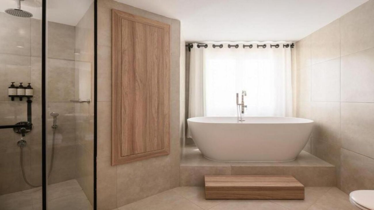 - Голям самостоятелен душ тип тропически дъжд и тоалетна