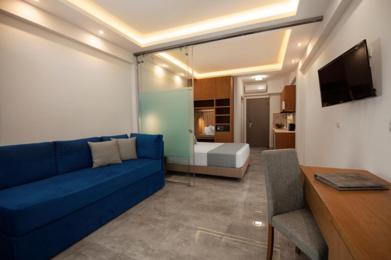 Apartment 2-Bedrooms (~ 44-48 кв.м) Намира се на приземния етаж (приземен етаж). Дневна с кухня, 2 отделни спални, двойно легло и 2 единични легла.