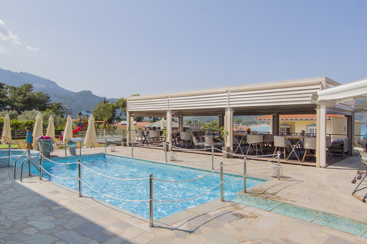 В хотела: предлага два басейна, открита хидромасажна вана (срещу допълнително заплащане), целодневен минимаркет, сувенирен магазин и детски площадки. Безплатен Wi-Fi достъп във всички части на хотела и изглед към градината или Егейско море. Шезлонгите и чадърите около басейните на хотела са безплатни.