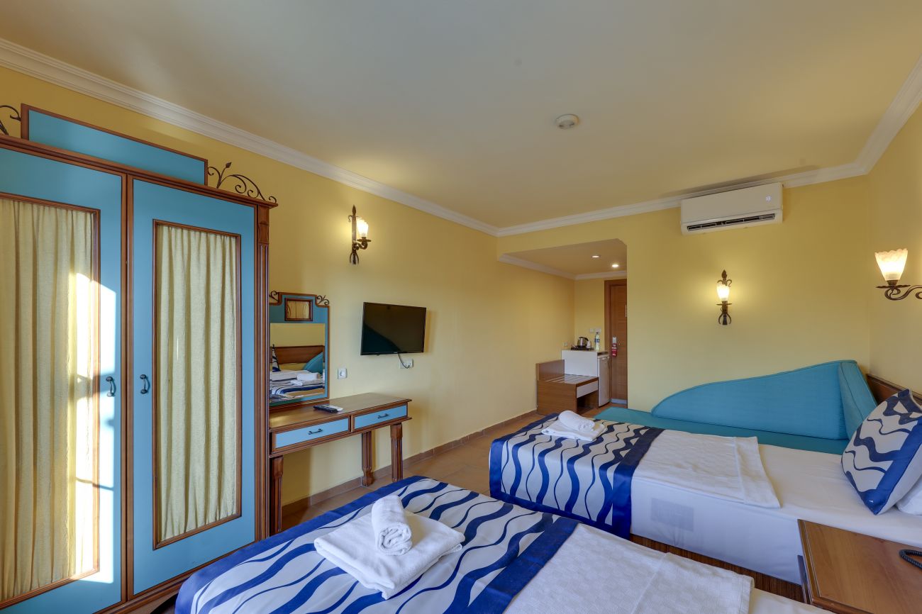 Хотелът разполага с общо 274 стаи, разположени в 3-етажни сгради, от които 33 Club room (нереновирани стаи - 26 м²),178 Hotel room (реновирани стаи, разположени в основен корпус или в триетажни сгради - 26 м²), 28 Club family room (нереновирани стаи, 2 спални, 1 баня - 45 м²) , 35 Family hotel room (реновирани стаи, 2 спални, 1 баня - 45 м²), Disabled Room (пригодени за хора с ограничена подвижност - 26 м²).