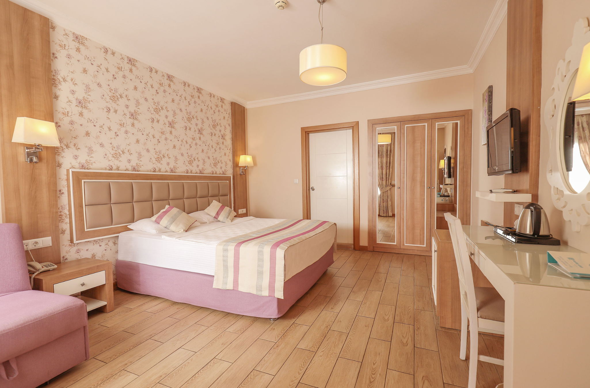 Всички стаи са оборудвани с климатик, телевизор, телефон, баня с душ/вана, сешоар, минибар (безплатно зареждане с вода и безалкохолни напитки ), сет за чай/кафе, сейф (безплатен), балкон или веранда. Почистване на стаите - всеки ден, смяна на спалното бельо и кърпите - 3 пъти в седмицата.