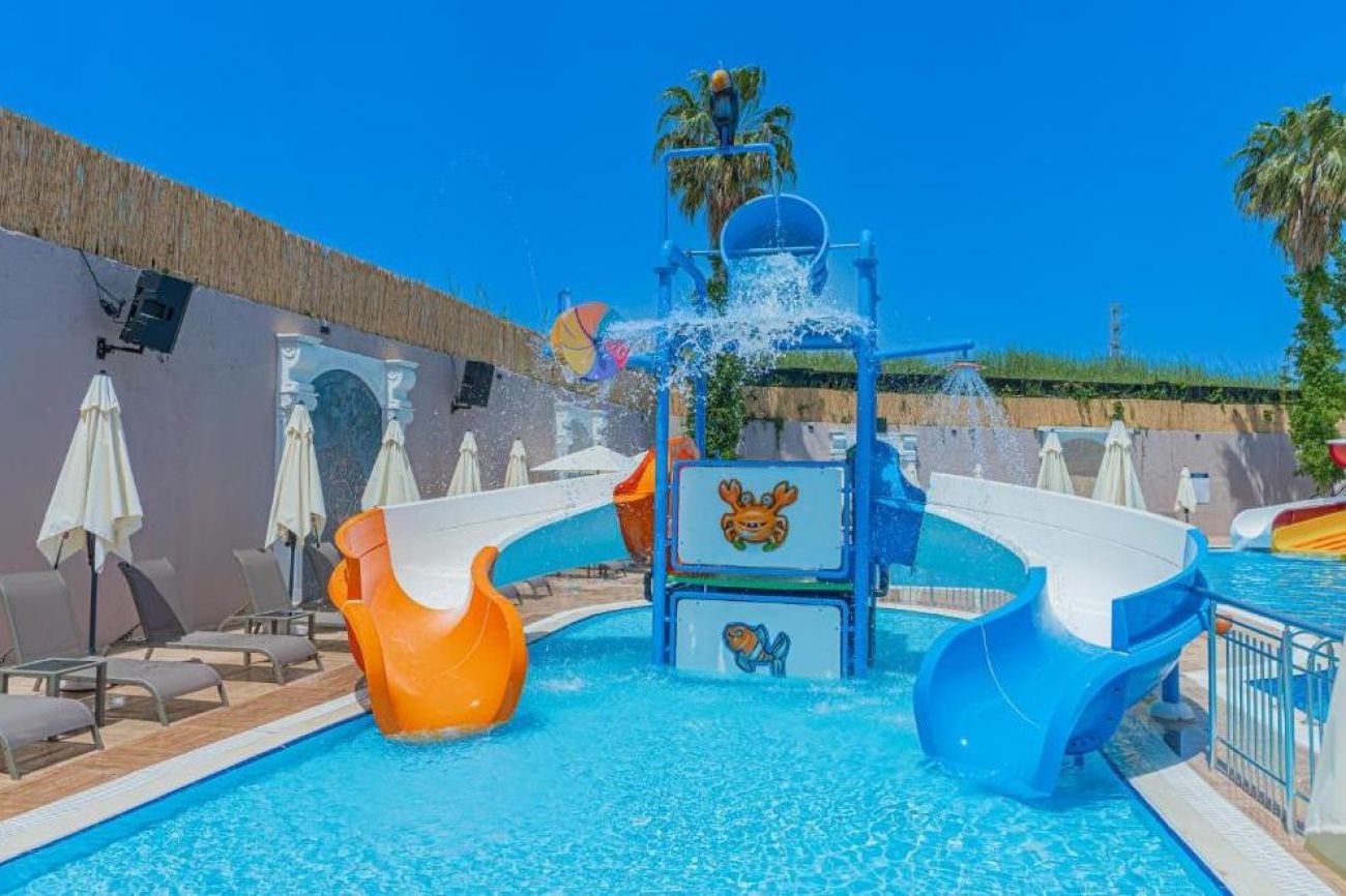 Собствен пясъчен плаж на 550 м от хотела. Открит басейн за възрастни: 500 кв.м, детски басейн 55 кв.м и две водни пързалки - по една за възрастни и деца.