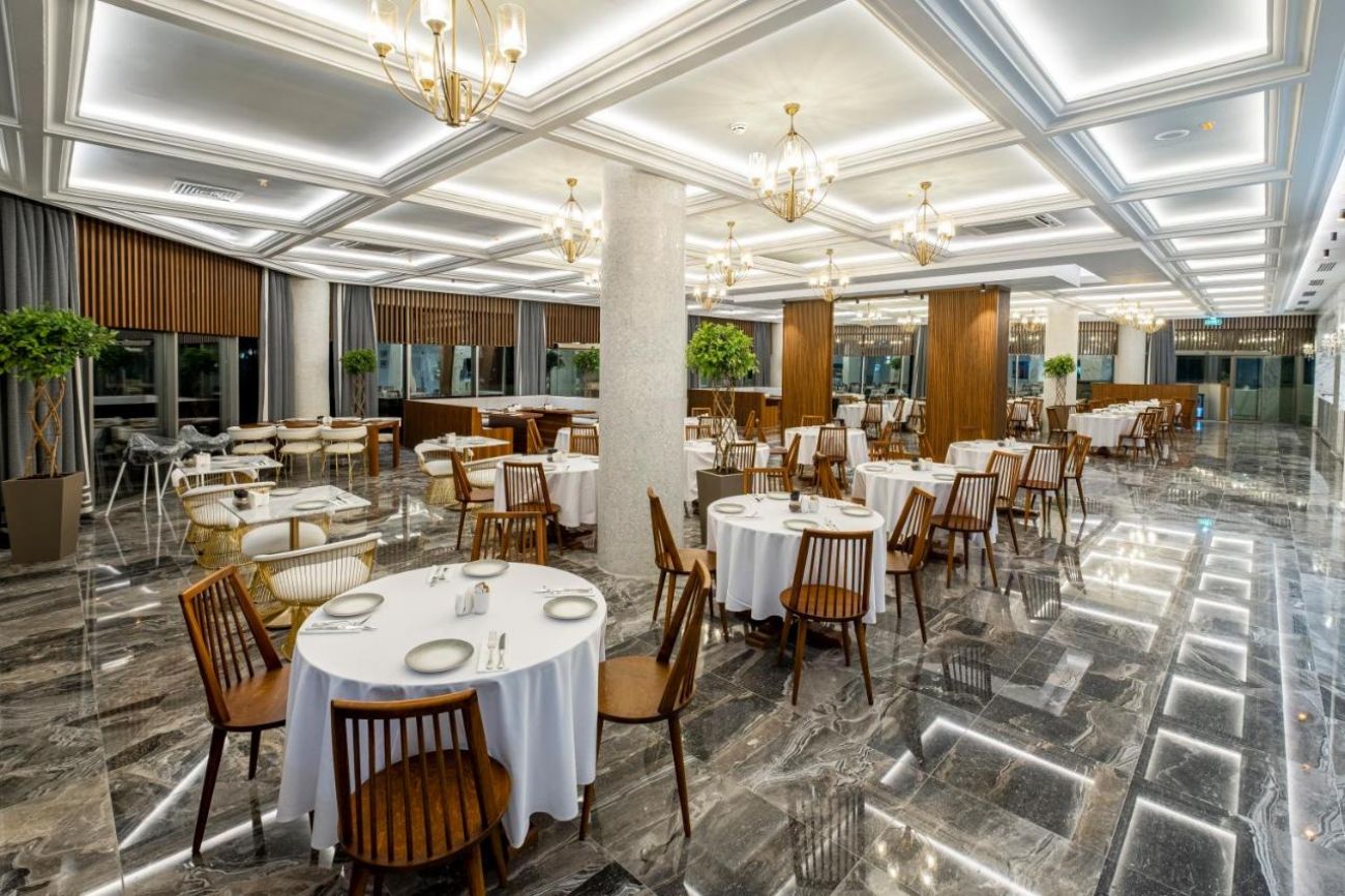 1 основен ресторант, а-ла-карт ресторант BISTRO TERRAZZA (24/7, интернационална кухня, без доплащане), ресторант THE WHITE LOUNGE (интернационална кухня, с предварителна резервация), сладкарница, 3 бара, 2 отрики и 1 закрит басейн, 4 водни пързалки, СПА център, фитнес, конферентна зала.