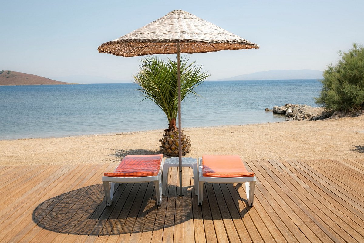 Собствен пясъчен плаж - чадъри, шезлонги и матраци на плажа и при басейна - безплатно.