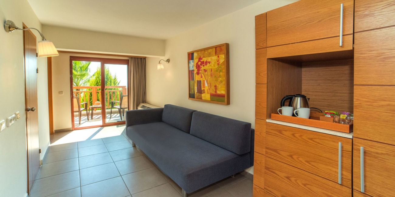 Хотелска част (девететажна сграда) с общо 320 стаи, от които: стандартни стаи с изглед градина (25 м²), с частичен изглед море (30 м²) и с изглед море (25 м²), супериор стаи с изглед море (40 м²), джуниър стаи с изглед градина (1 спалня - 31 м²), фамилни стаи с изглед градина (2 спални, 1 баня - 43 м²), стандарт суит (1 спалня, всекидневна, 1 баня - 50 м²), супериор суит (2 спални, всекидневна с кухненски бокс, 3 бани -119 м²), бизнес суит (1 спалня, всекидневна - 166 м²), стандарт суит с тераса (1 спалня, 1 баня, тераса с джакузи - 40 м²), стандарт суит с градина и тераса (1 спалня, всекидневна, 2 бани, градина с джакузи - 54 м²), супериор суит с басейн (2 спални, всекидневна, 2 бани, тераса с джакузи и басейн - 147 м²),