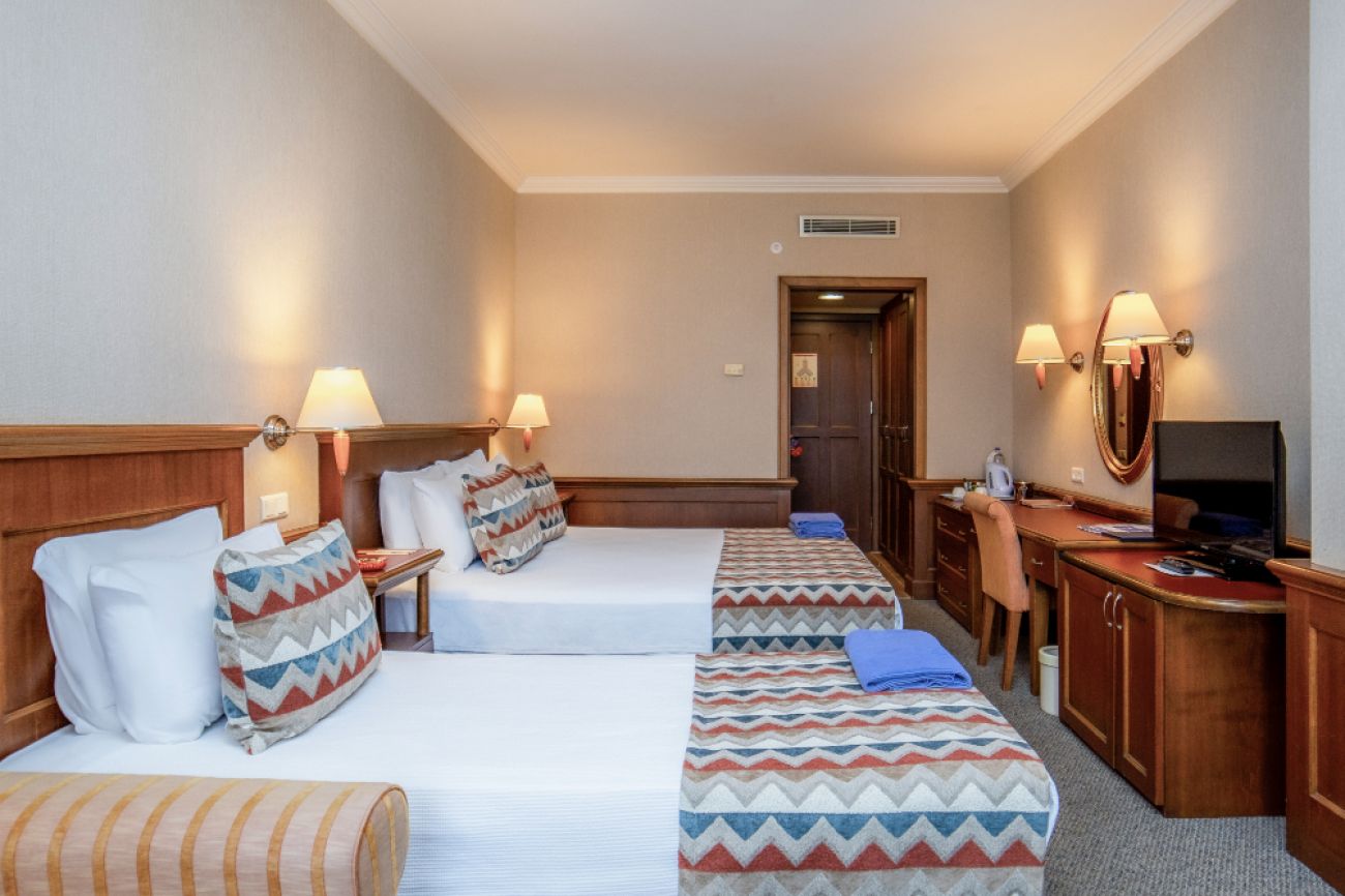 Всички стаи са оборудвани с двойно/две единични или двойно + единично легла, диван, балкон, климатик, телевизор , телефон, баня с душ/вана, сешоар, сет за кафе/чай, минибар (вода, безалкохолни напитки , бира – безплатно), сейф (срещу депозит).