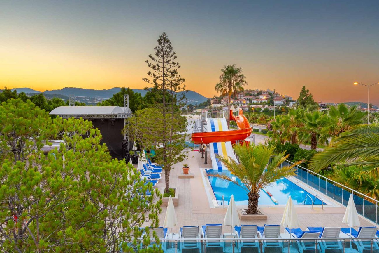 Намира се на 116 км от летище Анталия, на 126 км от центъра на Анталия, на 12 км от центъра на Алания, на брега на морето. Построен 1997 г., на обща площ от 10 000 м2. Частично реновиран 2019 и 2022 г.