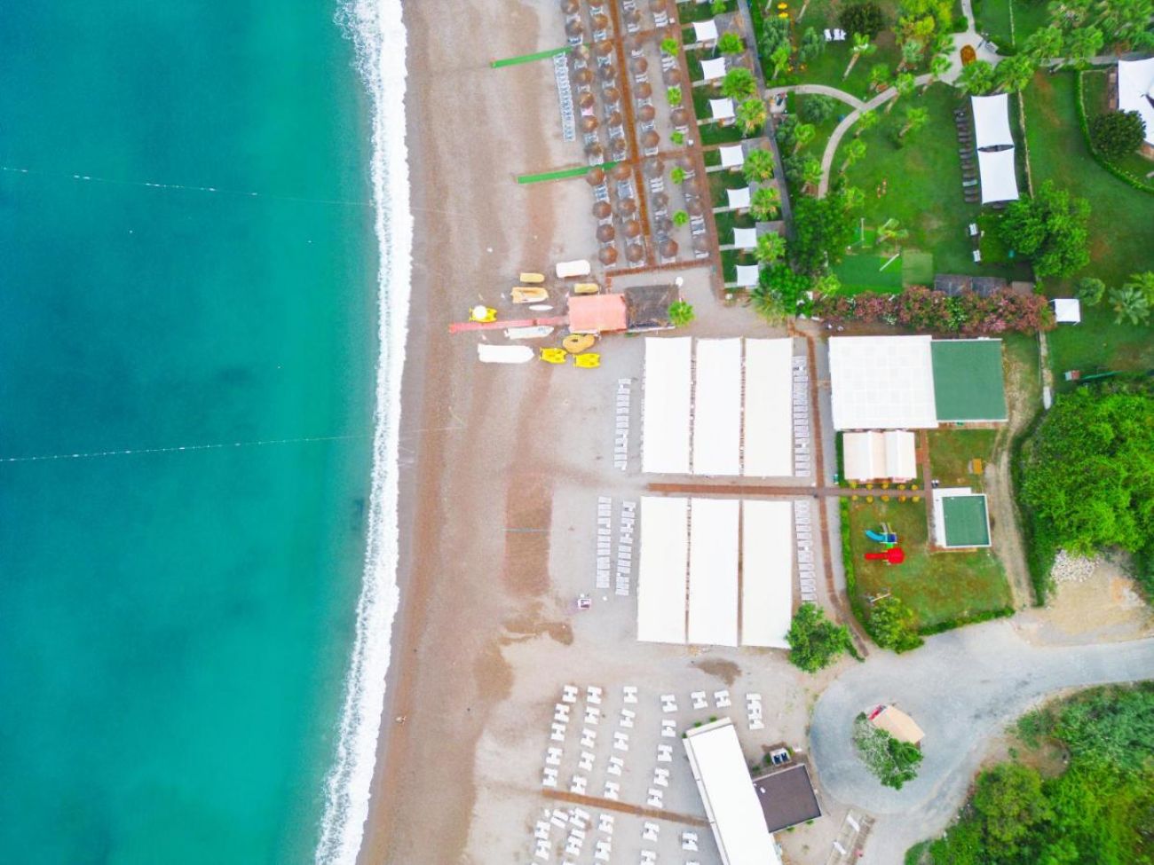 Собствен, на 500 м. от хотела, пясъчно-чакълест. Има осигурен безплатен шатъл. Чадъри, шезлонги и плажни кърпи на плажа и при басейна – безплатно.