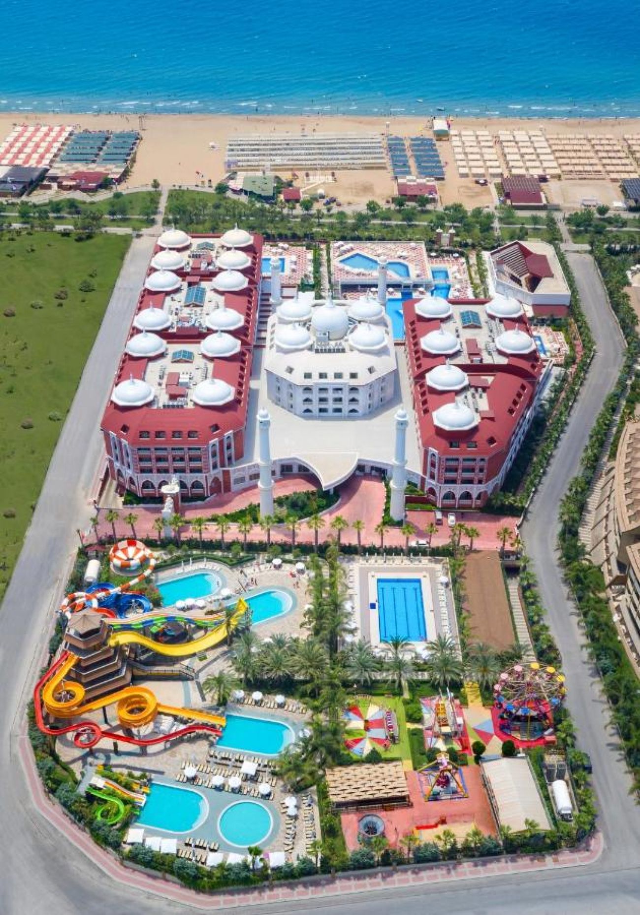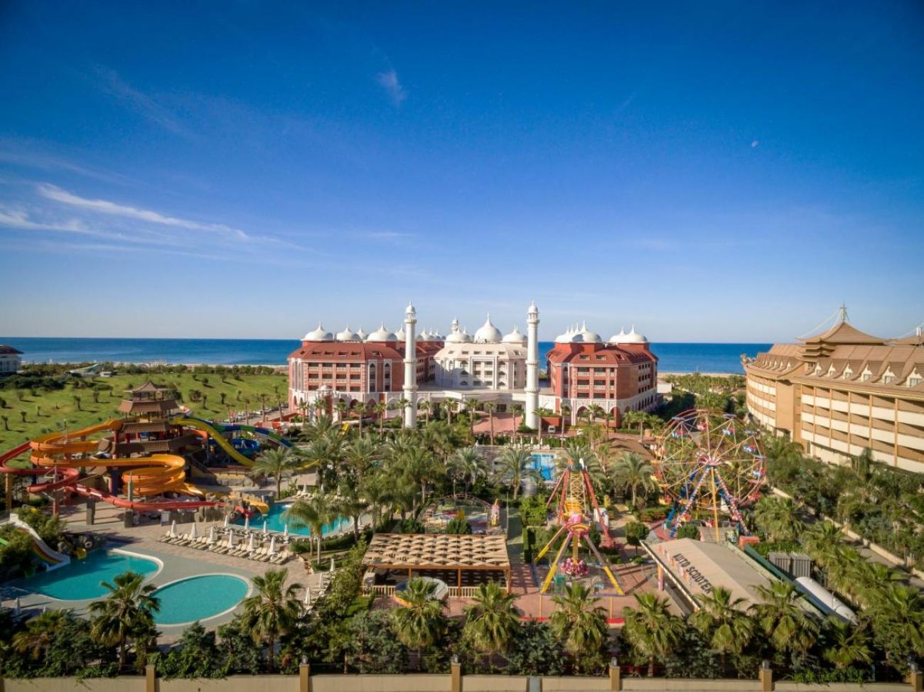 Основен ресторант, 3 а - ла - карт ресторанта (с предварителна резервация), 8 бара, 6 открити и 1 закрит басейн, 3 водни пързалки, магазини, SPA център, нощен клуб, конферентна зала. За децата: Детско меню, детски площадки, мини клуб (4-12 г.), 2 детски басейна, водни пързалки, мини дискотека, анимация, лунапарк, зоопарк. Безплатни услуги: Турска баня, сауна, фитнес, дартс, тенис на маса, плажен волейбол, аеробика, жива музика, анимация, интернет (в лоби). Платени услуги: Масаж, център за красота, фризьор, магазини, билярд, боулинг, интернет кафе, компютърни игри, химическо чистене, лекар, детегледачка, водни спортове, уроци по тенис, тенис на корт с осветление, скоростен интернет.
