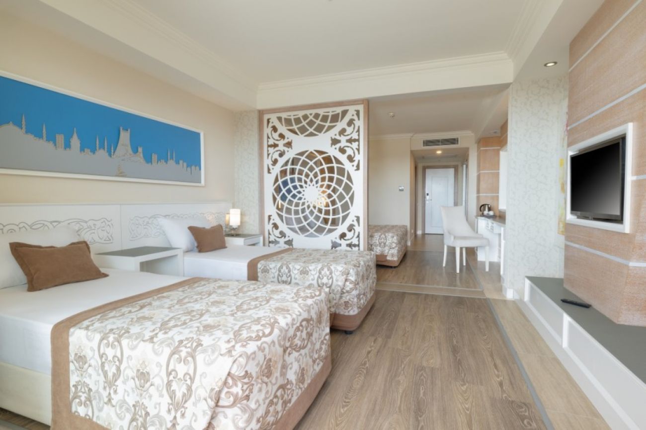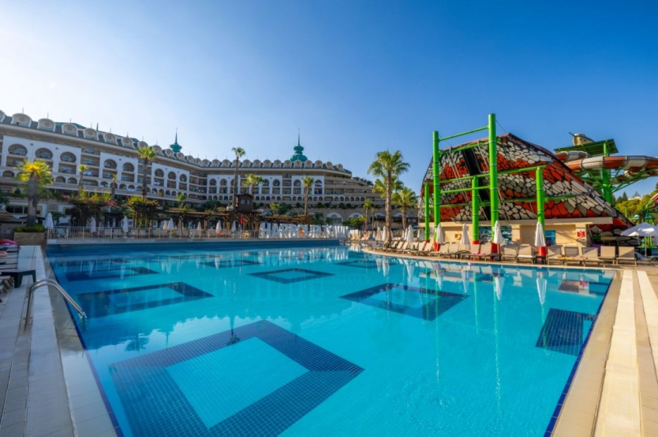 Хотелът е разположен на брега на морето, заобиколен от поддържани градини. На територията има няколко басейна с обзаведена слънчева тераса, голям воден парк с водни пързалки за възрастни и деца. Хотелът разполага със собствен пясъчен плаж с шезлонги и чадъри. Хотелът разполага с два основни ресторанта, които сервират шведска маса, а ла карт ресторанти, сладкарски бюфет с бърза храна, гьозлеме и суши. Заслужава да се отбележи а ла карт гурме ресторант, където се допускат само възрастни. Гостите могат да си поръчат освежаващи алкохолни и безалкохолни напитки на баровете. Хотелът предлага на гостите разнообразие от спортни дейности и развлечения, включително билярд, настолни игри, водна топка, аеробика, както и дневна и вечерна анимация. За малките гости има мини клуб, детски басейн и услуги за гледане на деца. Гостите могат да посетят фитнес центъра с фитнес зала и спа центъра със солна стая, който предлага разнообразие от процедури за лице и тяло, масажи и ароматерапия.