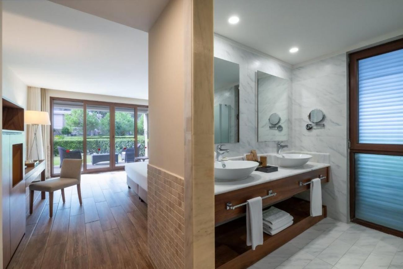 В стаите: Състои се от две основни сгради, комплекс от триетажни къщи и комплекс от едноетажни вили, разположени вътре в червена борова гора. Хотелът разполага с общо 560 стаи и всички са оборудвани с централен климатик, LED телевизор, телефон, баня с душ, сешоар, чехли и халат, сет за кафе и чай, минибар (безплатен), електронен сейф (безплатен), балкон или тераса, безжичен интернет (безплатно), под - ламинат. Почистване на стаите - всеки ден.