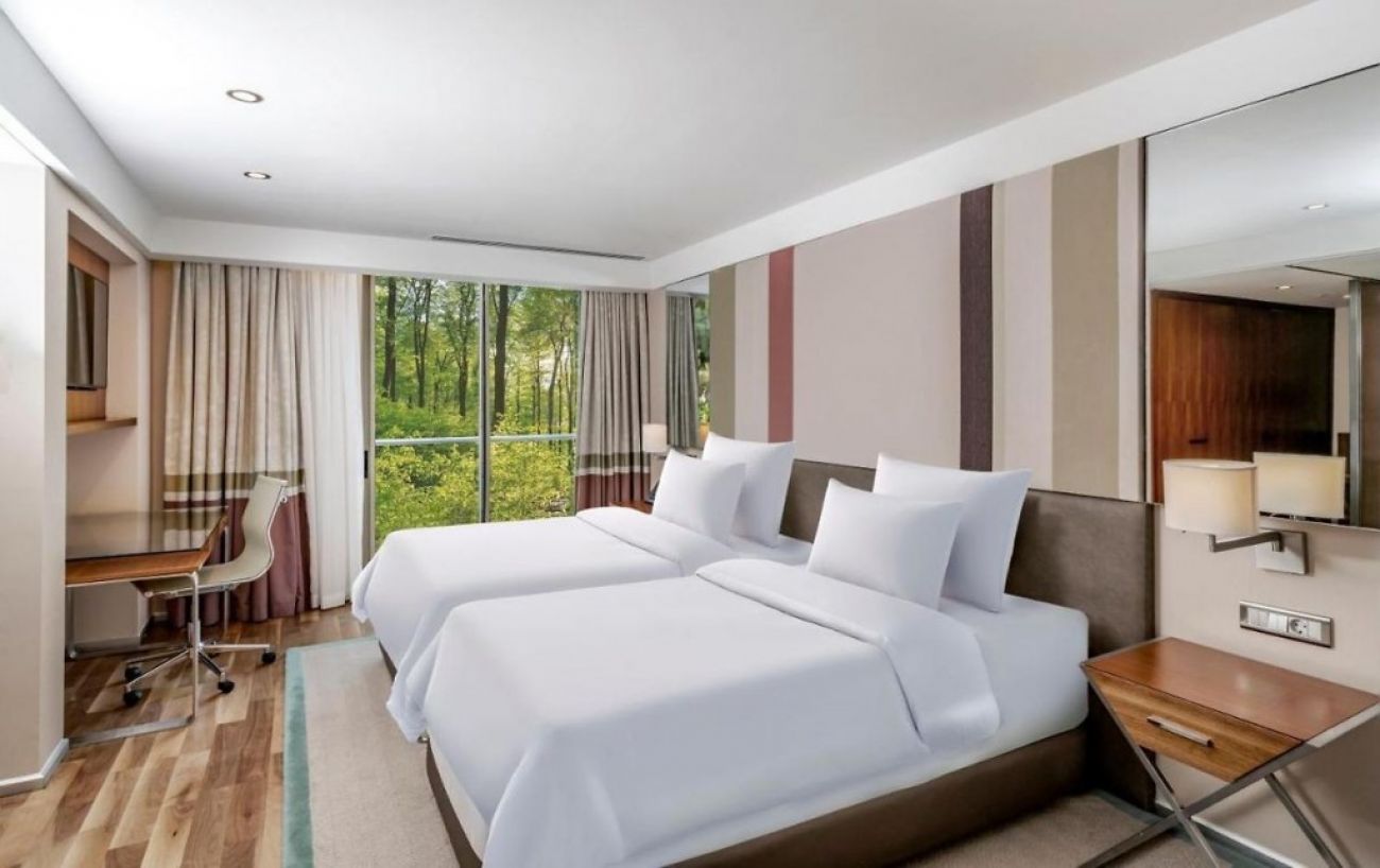 В стаите: Хотелът се състои от основна 5-етажна сграда с общо 401 стаи. Оборудвани са с индивидуално контролиран климатик, мини-бар, електрическа кана (чай и кафе асортимент, безплатно), телевизор (със система за двоен екран), музикален канал, игрална конзола (PlayStation 4, безплатно; задължително се оставя възвращаем депозит), проектор, директна телефонна линия в стаята и в банята, интернет (безплатно), баня, тоалетка и сешоар, сейф, балкон (не във всички стаи), под - килим. Почистване на стаите - ежедневно, смяна на спално бельо - 3 пъти седмично.