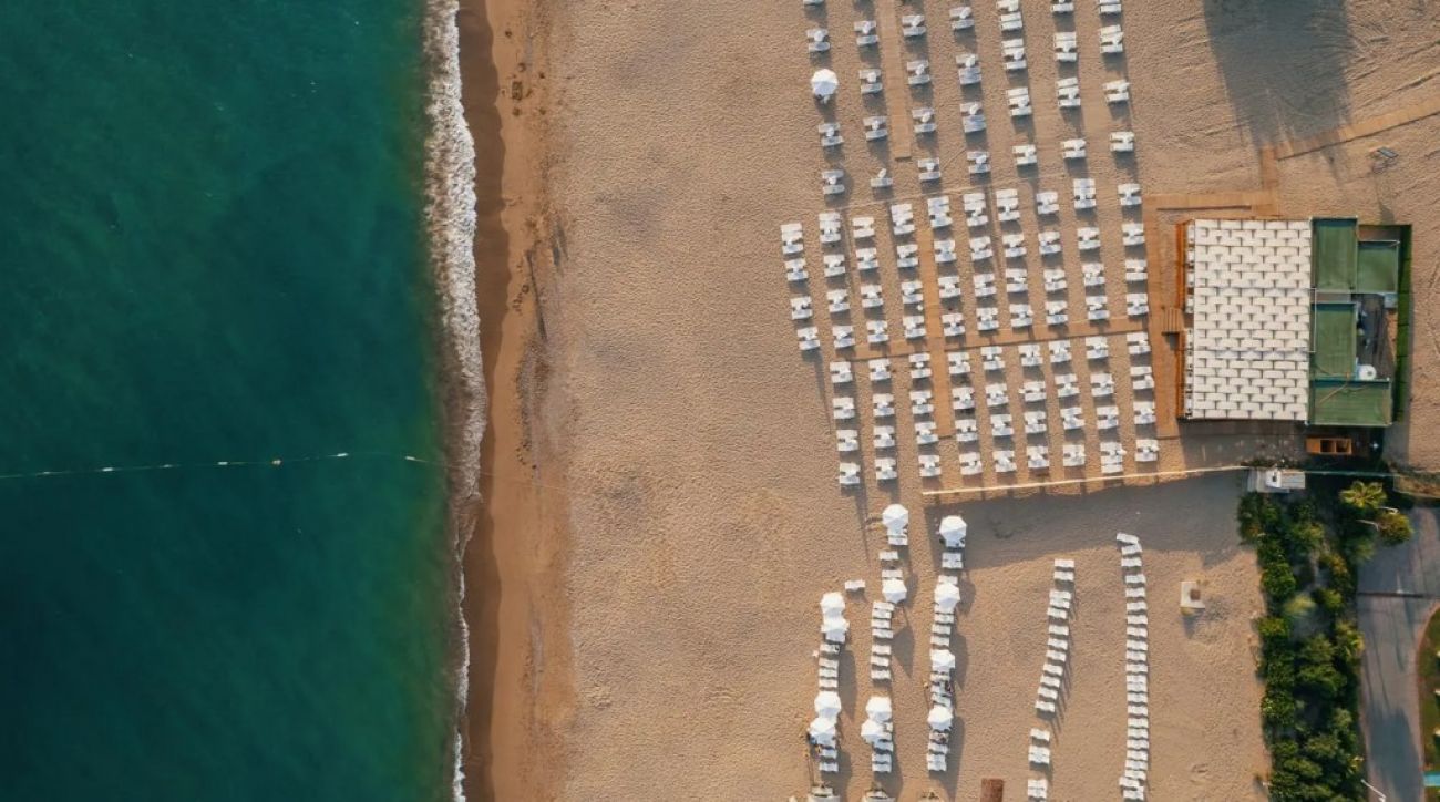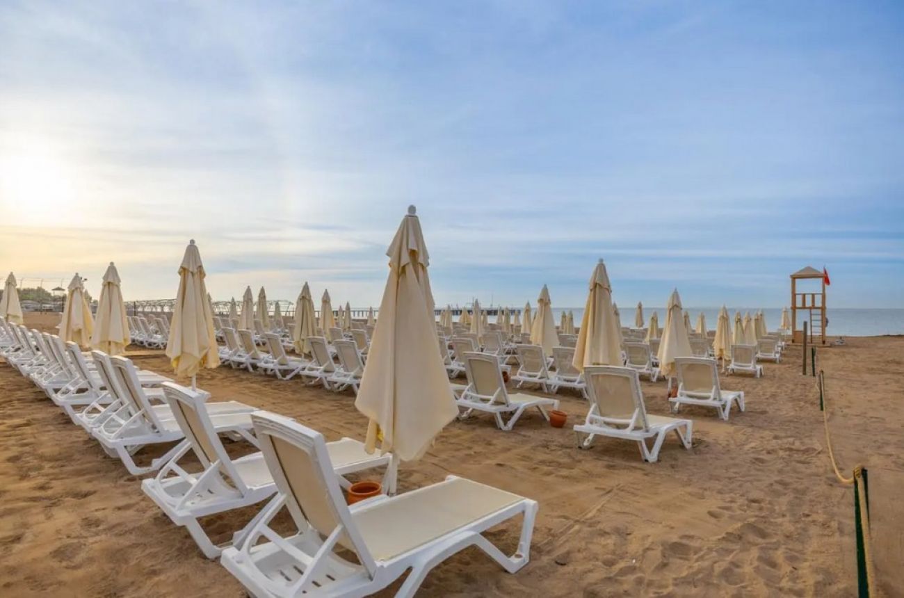 Собствен, пясъчно-чакълест на 900м от хотела с осигурен безплатен шатъл на всеки 15 минути. Чадъри, кърпи и шезлонги на плажа и басейна – безплатно.