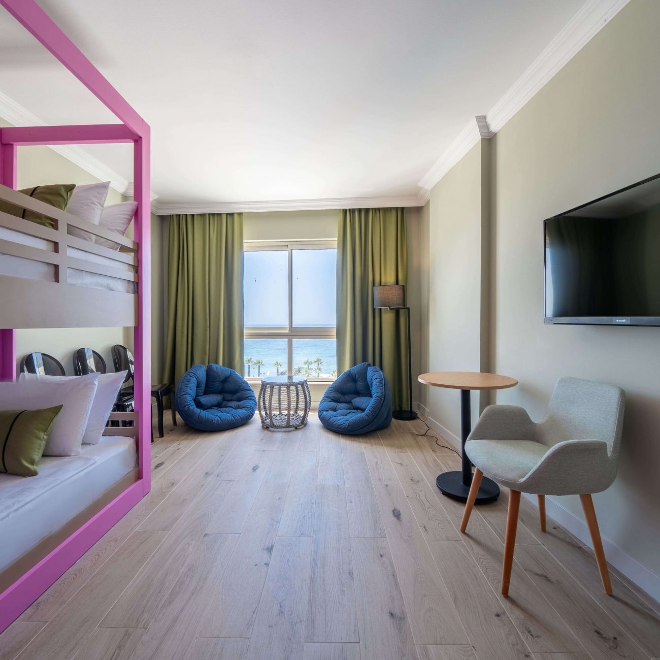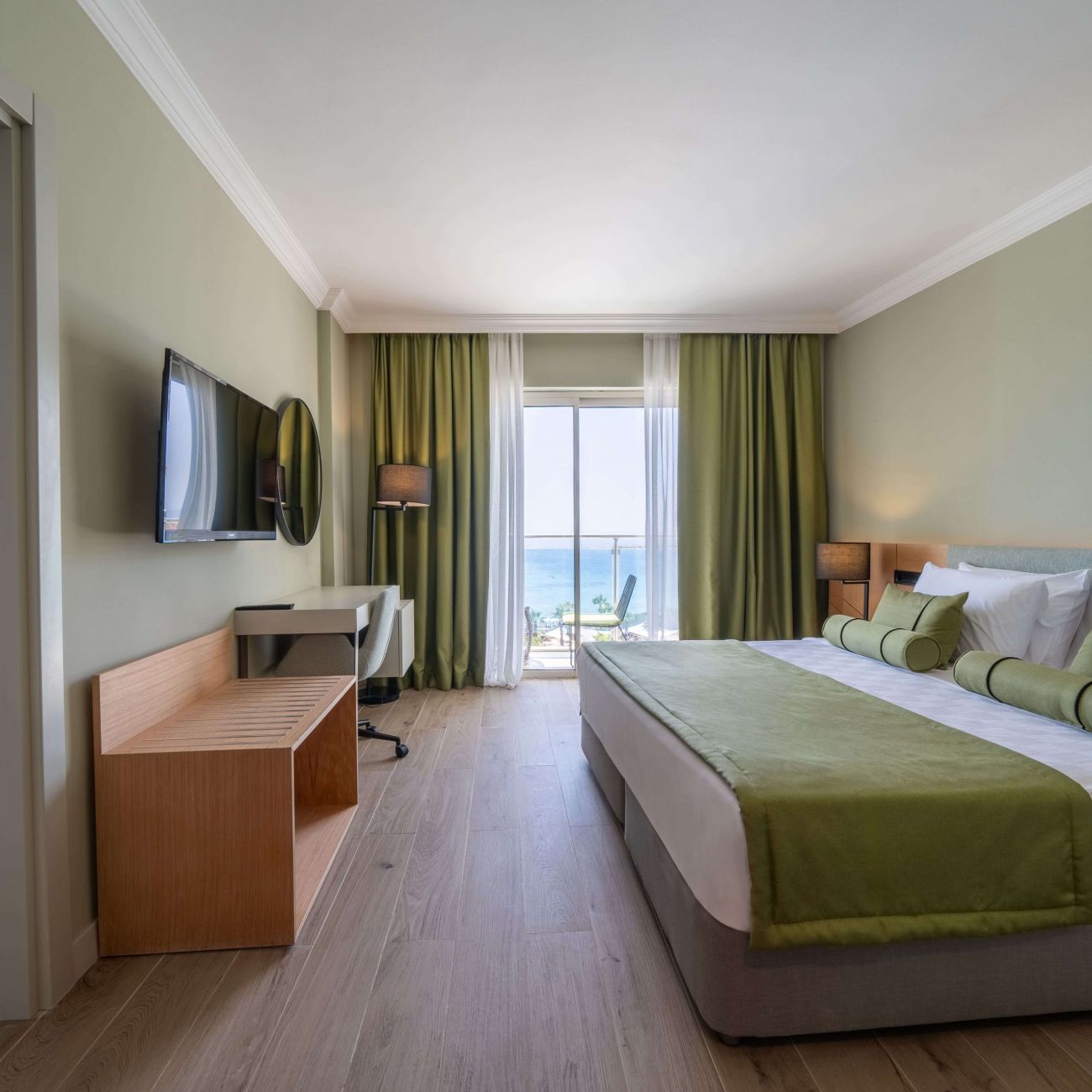 Хотелът разполага с общо 250 стаи, от които 66 стандартни стаи с изглед градина (20-30 m²), 138 стандартни стаи с изглед море (20-30 m²), 7 промо стаи (20-30 m²), 10 джуниор суита (спалня и всекидневна, 60 m²) и 29 фамилни суита (2 спални, 2 бани, 60 m²), разположени в основна сграда. Всички стаи са оборудвани с климатик, телефон, телевизор, баня с душ, сешоар, сет за кафе/чай, мини бар ( eжедневно зареждане с вода и безалкохолни напитки), сейф (безплатно), Wi-Fi, балкон в някои от стаите. Почистване на стаите - всеки ден, смяна на спалното бельо - 2 пъти в седмицата.