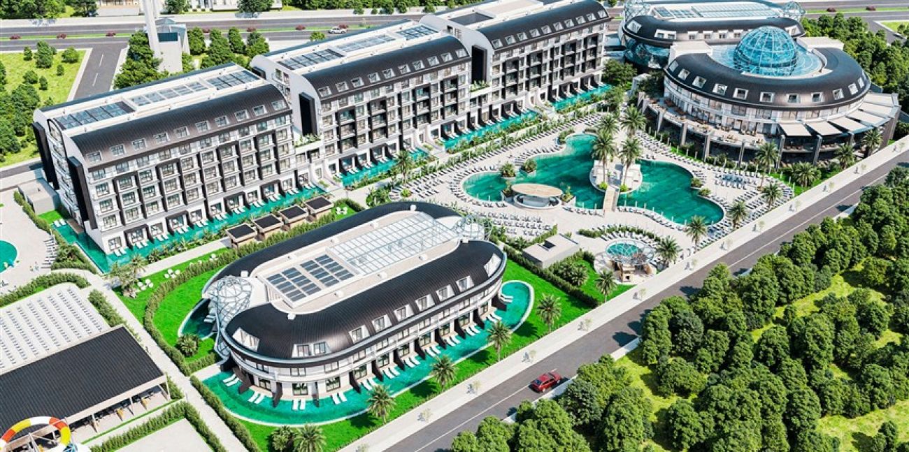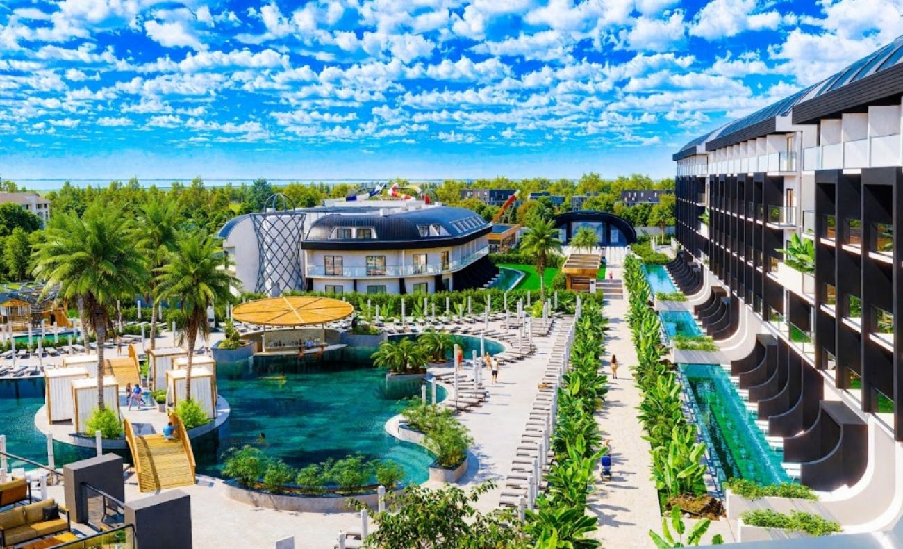 На територията на хотела: Модерният хотел се състои от основна сграда на четири до шест етажа и островна сграда на три етажа, общо 486 стаи с няколко асансьора. Разнообразните хотелски съоръжения включват елегантно лоби с места за сядане, рецепция и лоби бар, бюфет-ресторант с тераса, различни а-ла-карт ресторанти (от 1 май, според наличността и резервация за минимален престой от седем нощувки, включително и от Включени 14 нощувки втори път), 24-часов снек ресторант, няколко бара, дискотека, закрит плувен басейн (сезонен) с отделен детски басейн (отворен сезонно) и сладкарница. Магазини, минимаркет и фризьор срещу заплащане. Wi-Fi е включен в целия хотел и плажната зона. В добре поддържаната градина има сладководен басейн, аквапарк с пет водни пързалки за възрастни и детски аквапарк с три водни пързалки за най-малките (на час от 1 май), слънчева тераса и бар на басейна. Шезлонгите, възглавниците, чадърите и плажните кърпи са безплатни на басейна и на плажа в плажния клуб.