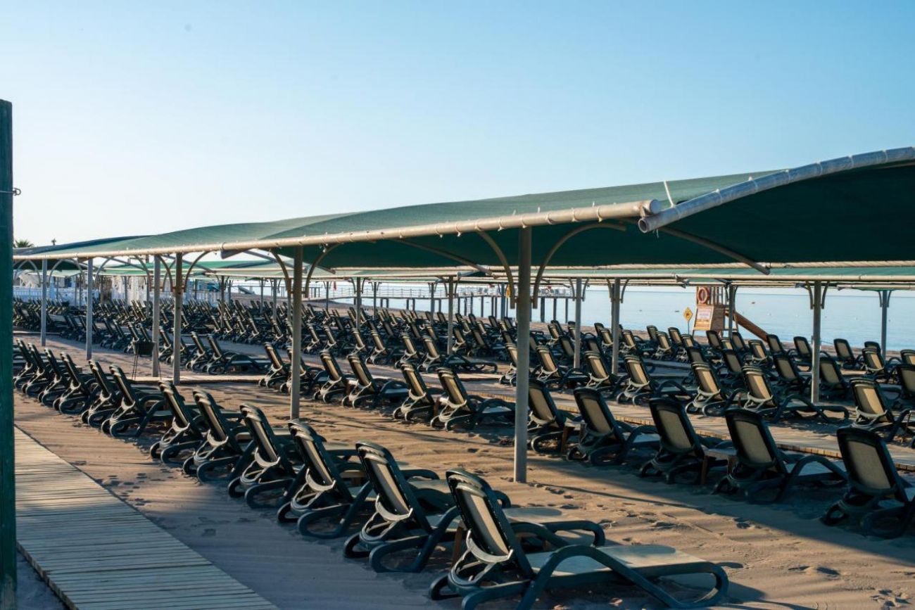 Собствен, пясъчно - чакълест. Чадъри, шезлонги и плажни кърпи на плажа и при басейна – безплатно.